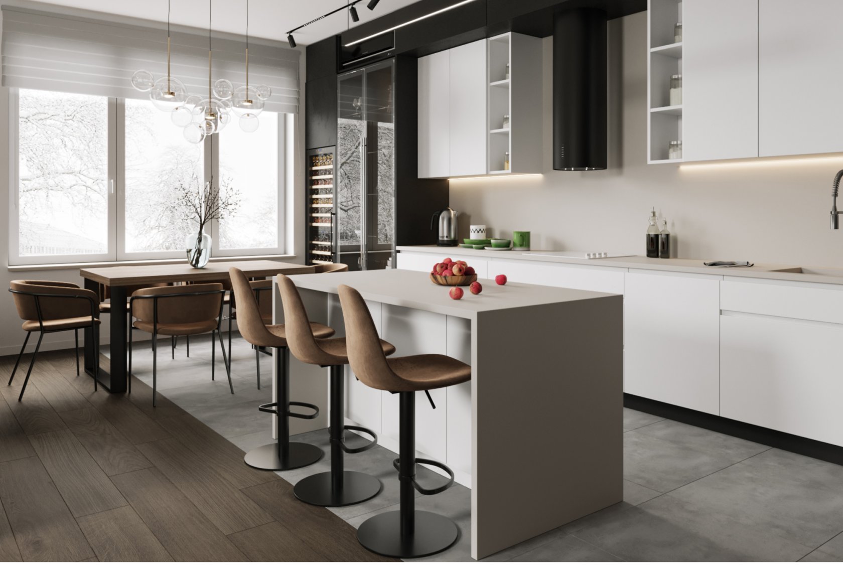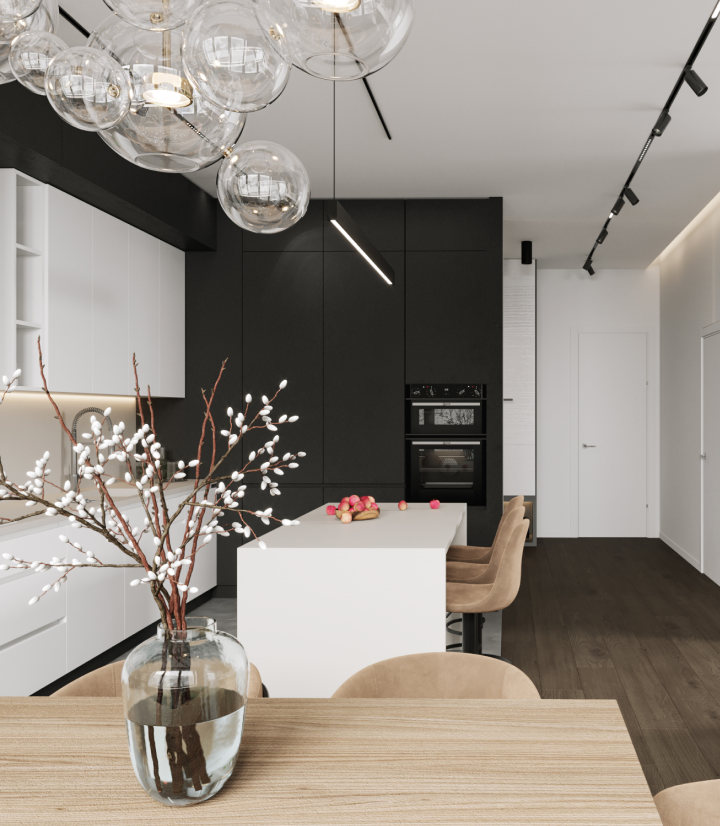 и современный дизайн, который сочетает желания заказчика, простоту и функциональность. Была создана просторная гостиная, подходящая как для того, чтобы наслаждаться готовой едой из ресторанов,